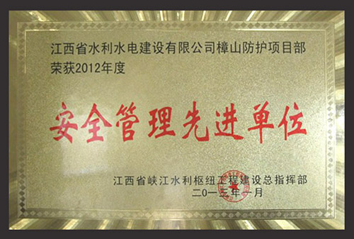 2013年2月,江西省峡抖圈官网利枢纽工程建设总指挥部授予我公司樟山防护工程项目部“2012年度清静治理先进单位”声誉称呼,项目治理职员彭红军、邓敏被评为峡抖圈官网利枢纽“清静生产先进小我私家”。