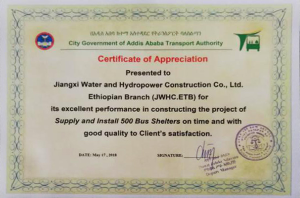 克日,埃塞有限公司收到亚的斯亚贝巴市交通局揭晓的谢谢证书,表扬公司在承建亚的斯亚贝巴市500套公交候车亭供货与装置项目上体现优异。