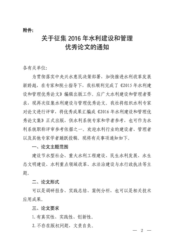 转发征集2016年水利建设和治理优异论文的通知